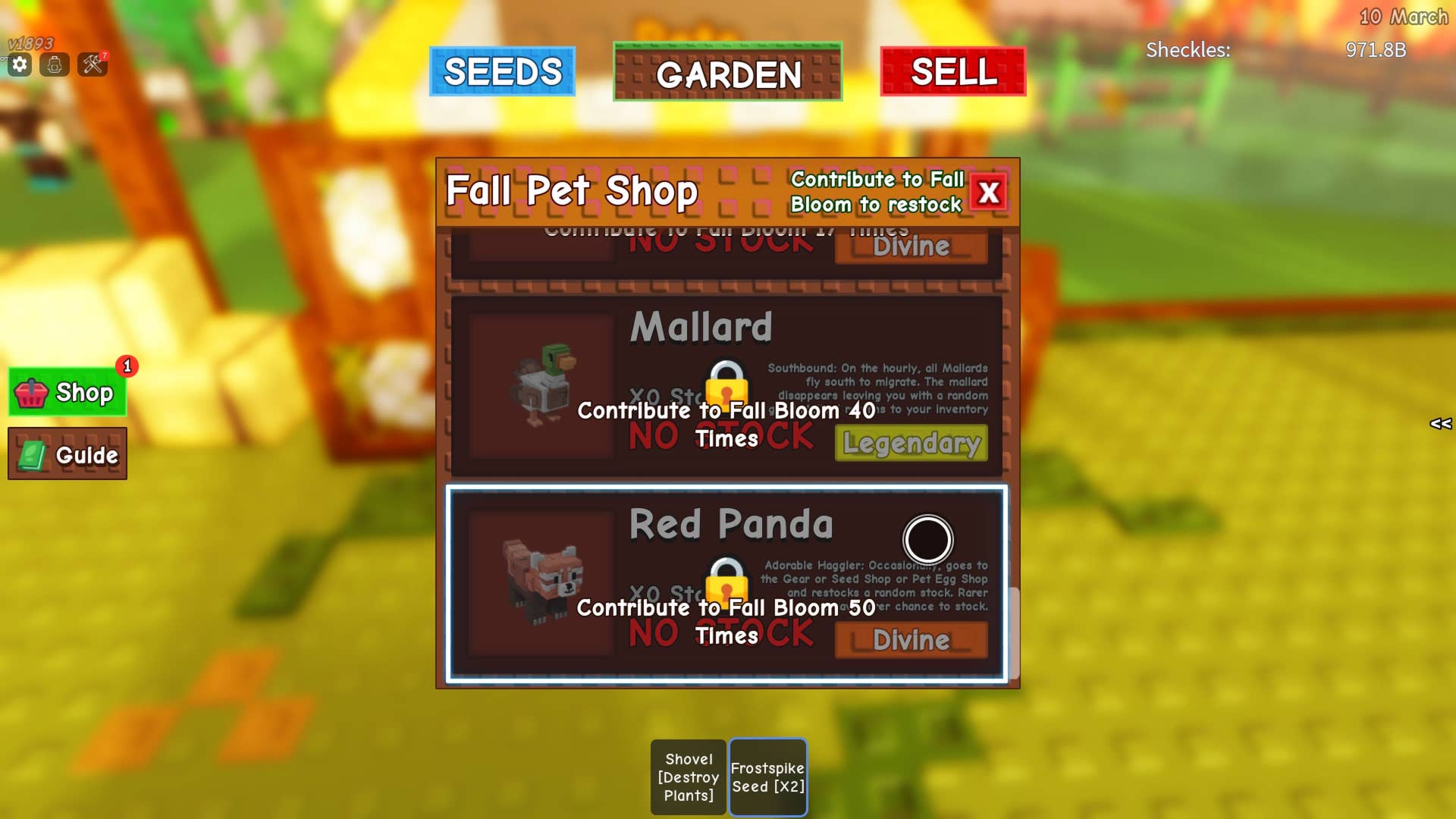Конечно, старайтесь вносить вклад в Осеннее цветение как можно чаще — не только чтобы открыть возможность покупки питомца, но и чтобы пополнить его наличие. Возможно, имеет смысл дождаться нужной суммы Sheckles, прежде чем отдавать вклад: тогда вы сможете одновременно внести вклад и сразу купить питомца.