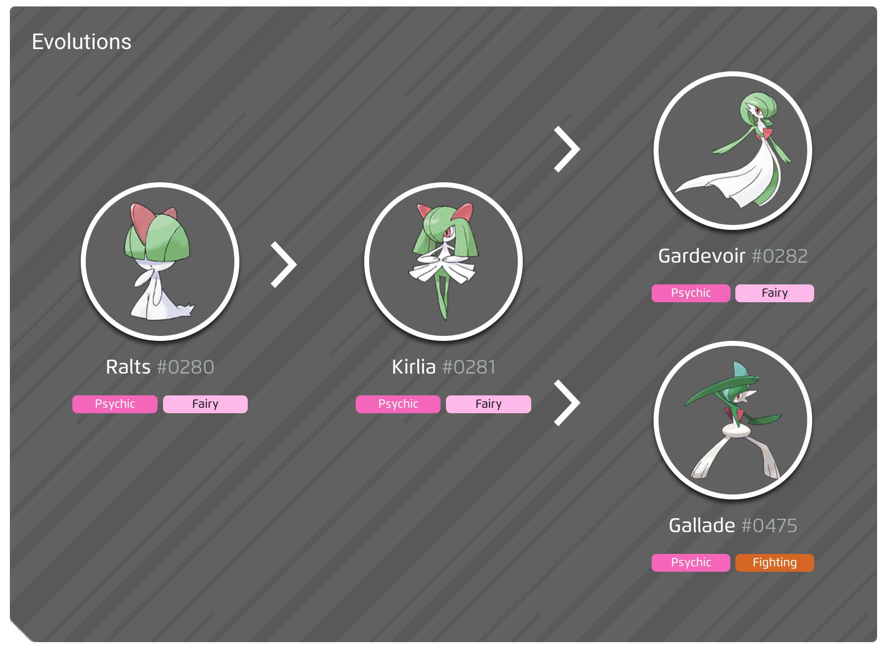 Блестящий Кирлия почти идеально следует этому, выбирая более светлый (очень бледно) розовый для тела/пачки. Поскольку Гардевуар была первоначальной эволюцией, это продолжается и в платье Гардевуара, которое имеет лишь легкий намек на розовый цвет.